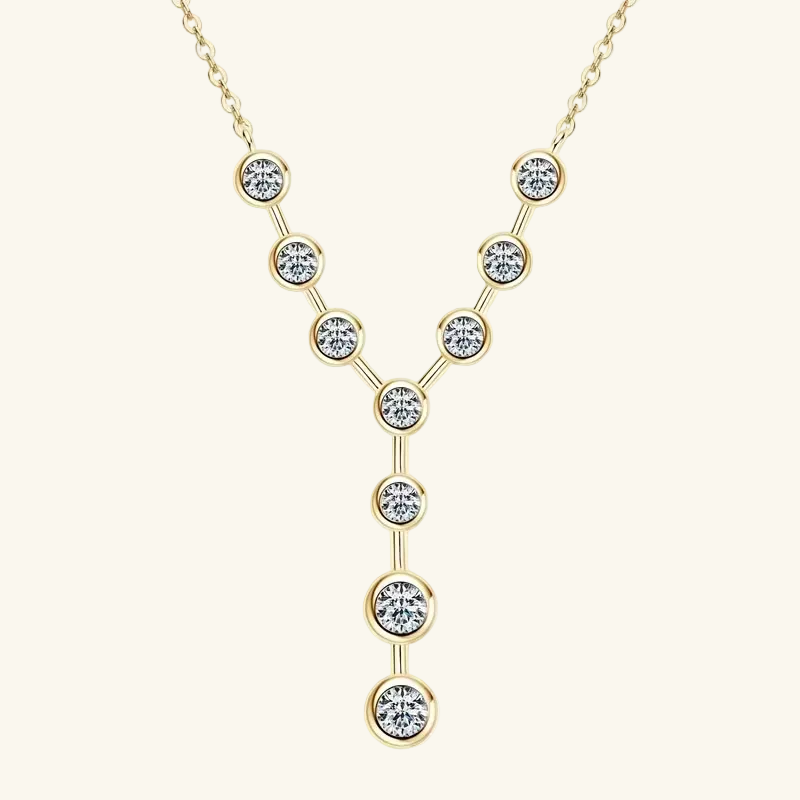 Introducing our breathtaking Multi-Stone Moissanite Cross Necklace, a stunning constellation of bezel-set D-Color moissanite stones arranged in a graceful cross formation. Each stone is individually encased in a smooth, polished bezel setting, connected by sleek golden or silver bars that flow together like stars mapped across the night sky.