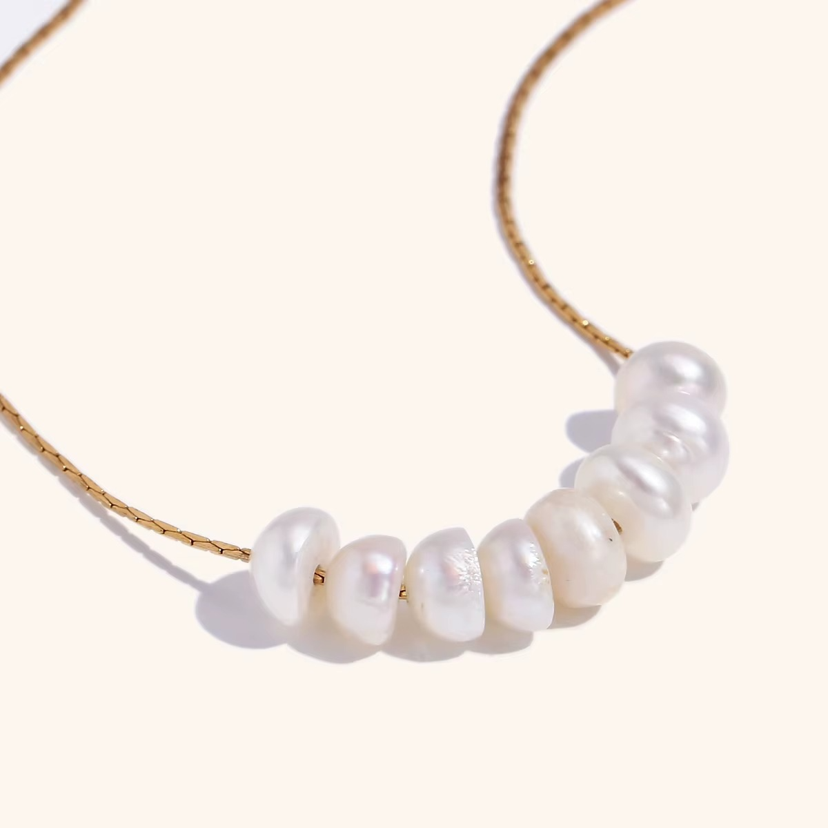 Each pearl is naturally shaped, creating a subtle rhythm across the neckline while reflecting light with a delicate, creamy glow. The minimal silhouette feels modern yet timeless — elegant enough for special occasions, effortless enough for everyday wear.